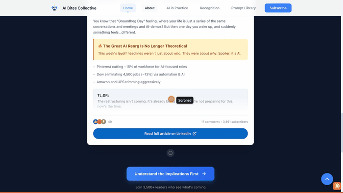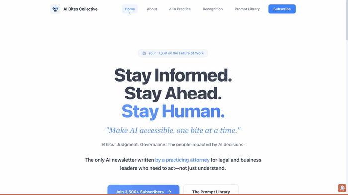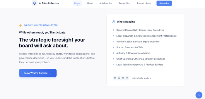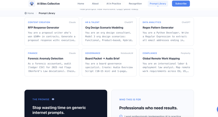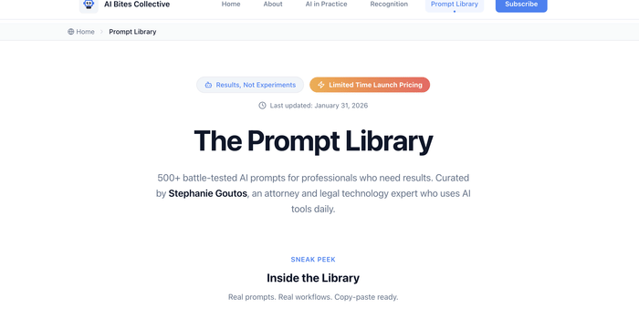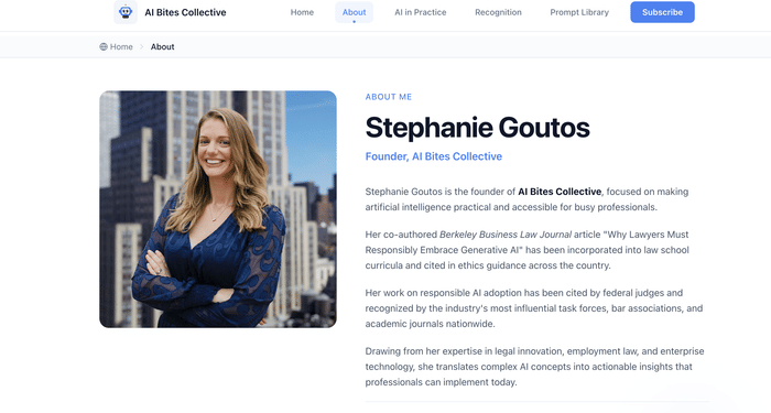 AI Bites Collective is a production-grade personal brand platform built entirely with AI in a single weekend. It replaces a basic Google Sites page with a full React application that brings together Stephanie Goutos’ Weekly AI Bites newsletter, a 500+ premium prompt library built from real legal and operational workflows, and a centralized thought leadership and professional recognition experience.