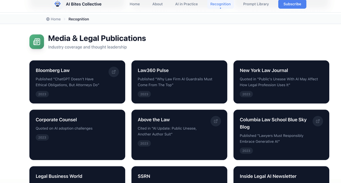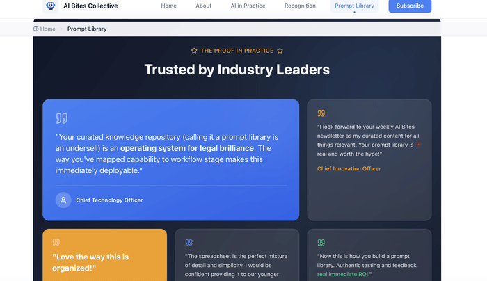 Prompt Library expansion Added Prompt Library teaser cards, updated tagline messaging, expanded media citations, and incorporated 14 curated testimonials from subscribers and legal professionals.