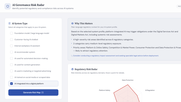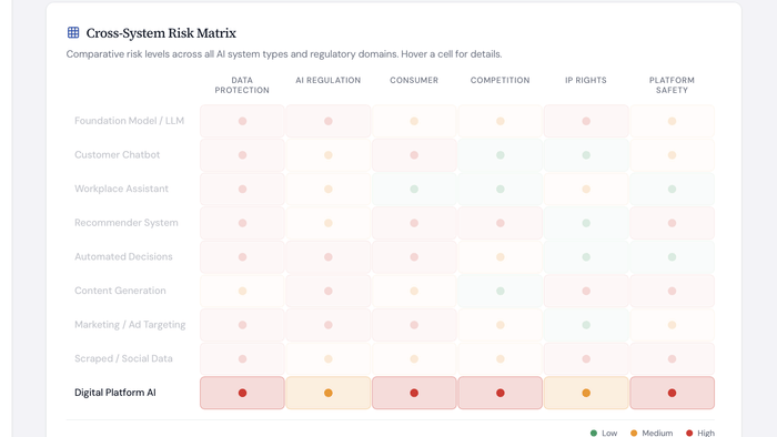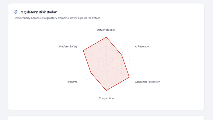 - A breakdown of relevant legal risk areas (privacy, AI regulation, consumer protection, competition, IP, etc.); and