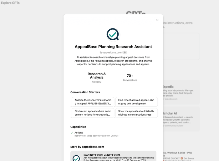 The result is grounded support for planning lawyers, local authority counsel, planning officers, developers, and agents—AI or non-AI. No hallucinated appeal references, no manual trawling through PDFs, just reliable precedent at speed.