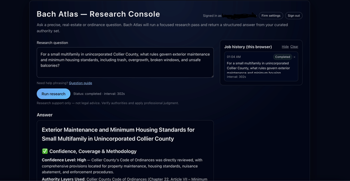 It’s designed for matters where one question actually spans multiple layers of law at once; state statutes, county codes, city ordinances, special-district rules, and governing case law. Instead of days of tab-surfing, Bach Atlas returns a single, citation-backed view of how those layers fit together.