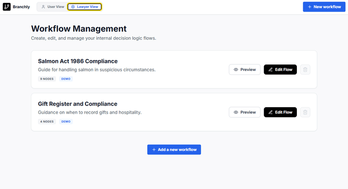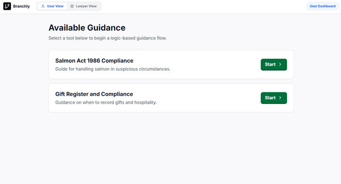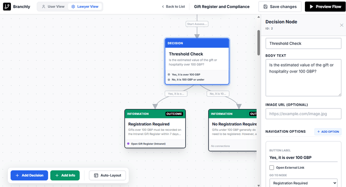 Branchly is a visual decision-tree builder for creating interactive guidance workflows. Think of it as a choose-your-own-adventure for legal compliance.