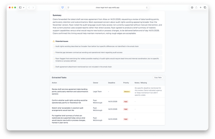 This project is a lightweight tool for extracting structure and intent from messy internal communications, especially email chains that sit upstream of legal work. Lawyers and legal-adjacent teams often receive requests in the form of fragmented emails, forwards, side comments, and implied expectations. Important details like deadlines, assumptions, trade-offs, and risk tolerance are rarely stated cleanly. Instead, they’re scattered across replies, tone, and context. The tool ingests an email chain and surfaces: what is being asked who is implicitly responsible deadlines and timing pressure areas of uncertainty or unresolved questions signals of commercial versus risk-driven intent It does not provide legal advice or judgement. Its purpose is to reduce cognitive load and prevent context loss by making the shape of the request visible before substantive legal work begins.