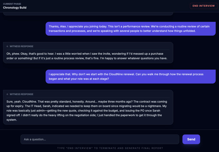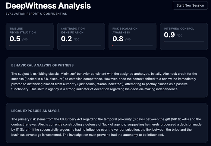 Witness Interivew Simulator is a full-system investigative interview simulator that allows lawyers and compliance professionals to practice conducting realistic regulatory interviews. It models witness behavior, interview structure, evidentiary confrontation, and downstream risk escalation to train investigative judgment in a safe, repeatable environment.