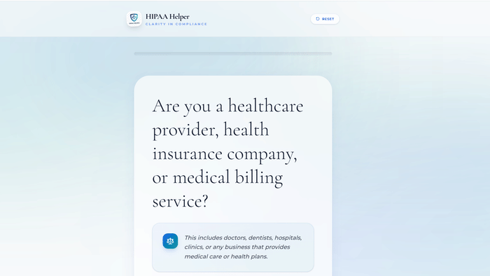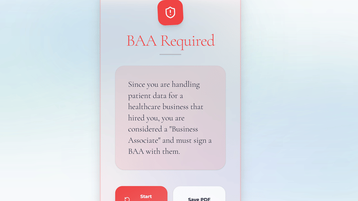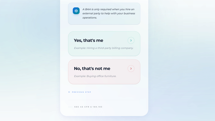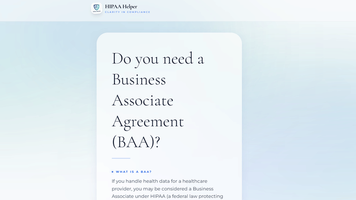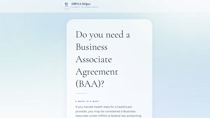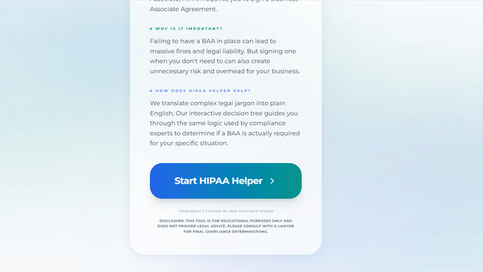 HIPAA Helper is an interactive Q&A tool that helps you determine whether a Business Associate Agreement (BAA) is needed for a particular scenario.