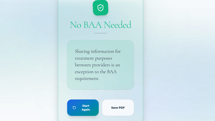 HIPAA Helper helps you determine whether a Business Associate Agreement (BAA) is needed for a particular scenario.