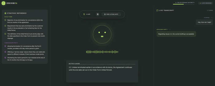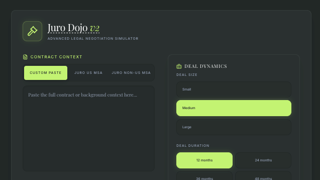 Juro Dojo is an internal training tool I built with my team to fix that. It puts you in a live voice negotiation against an AI counterparty playing customer counsel, using real clauses from Juro's own MSA. You negotiate out loud, in real time, as if it were an actual call.