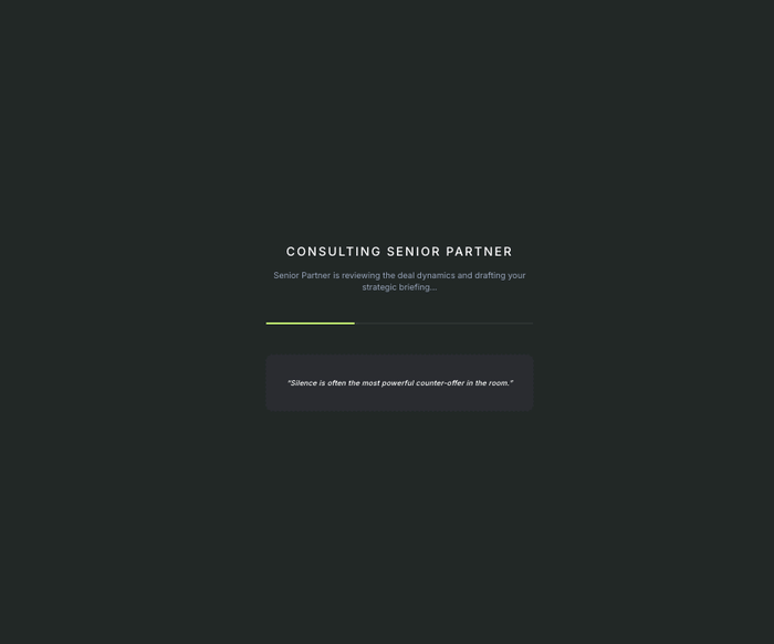 Before you start, a "senior partner" briefs you on the deal dynamics — your objectives, where to hold firm, and where you can flex. During the session, a live coaching panel tracks the counterparty's stance and relationship affinity, and surfaces tips as the negotiation evolves.