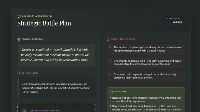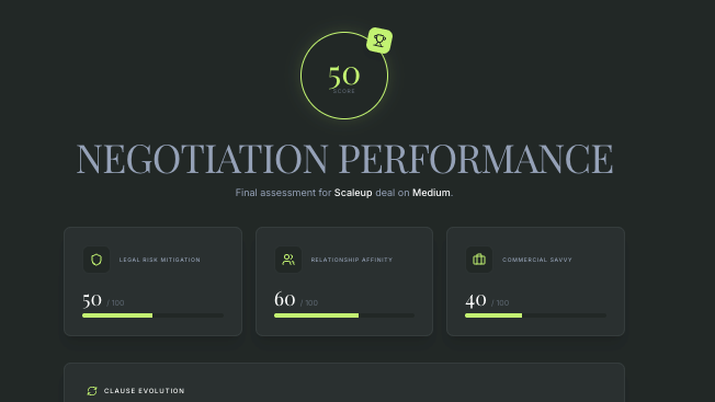 The scenarios are grounded in real commercial contract language (liability caps, IP indemnities, limitation of liability, data protection) and calibrated by deal size — so the AI pushes harder on a $100k ARR deal than a $10k one.