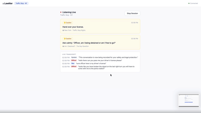 LawAIer (formerly LawCoach) is a real-time, multimodal legal assistant designed to protect individuals' rights during high-stakes encounters, such as traffic stops, police interactions, or document signings.