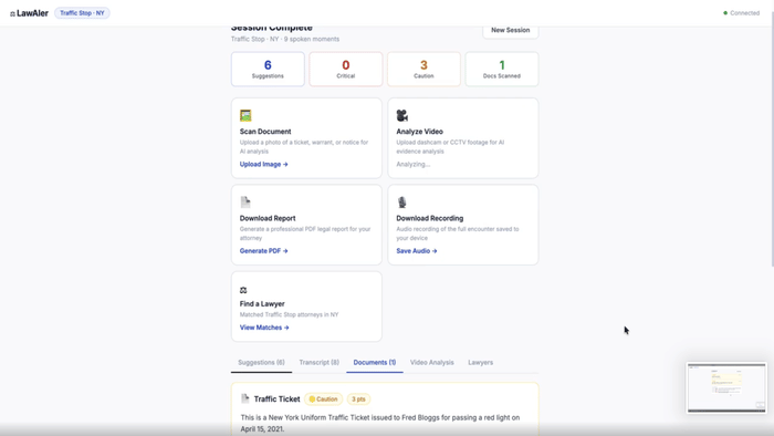 Automated Incident Reporting: At the end of a session, the system synthesizes the live transcript, the detected legal issues, and the scanned documents into a professional PDF Incident Report. This can be sent directly to a lawyer or used for insurance and court purposes.
