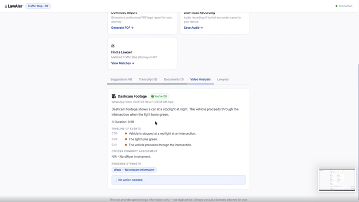 Live Coaching (Multimodal AI): The app listens to live audio (in 4-second chunks) and uses Gemini 2.0 Flash to provide instant coaching cards. For example, if it hears an officer ask, "Can I search your vehicle?", the app displays a card: "You have the 4th Amendment right to refuse. Say: 'I do not consent to a search.'"