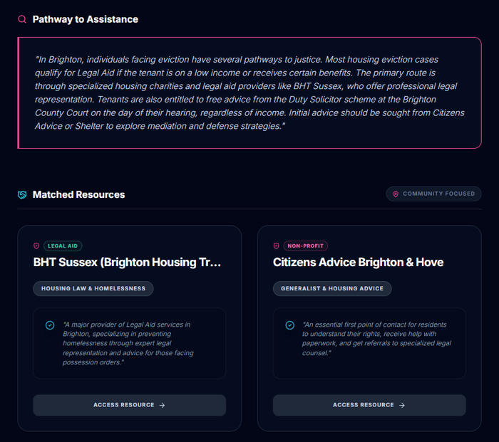 - Suggests pro bono networks, legal aid clinics, and community advocates