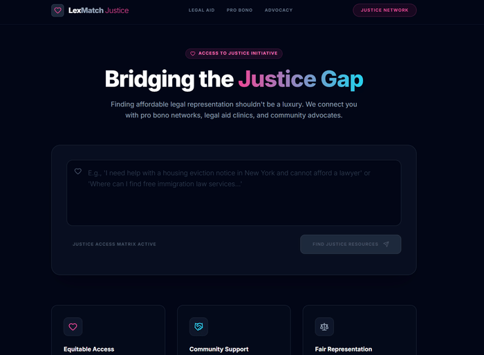 We built this live during a vibecoding demo with students at the University of Sussex. This prototype tackles the Access to Justice challenge by connecting people with pro bono networks, legal aid clinics, and community advocates. As a demo prototype, it shows how you can go from idea to demo app in a couple of prompts. While Matt is submitting it, the idea came from the students.
