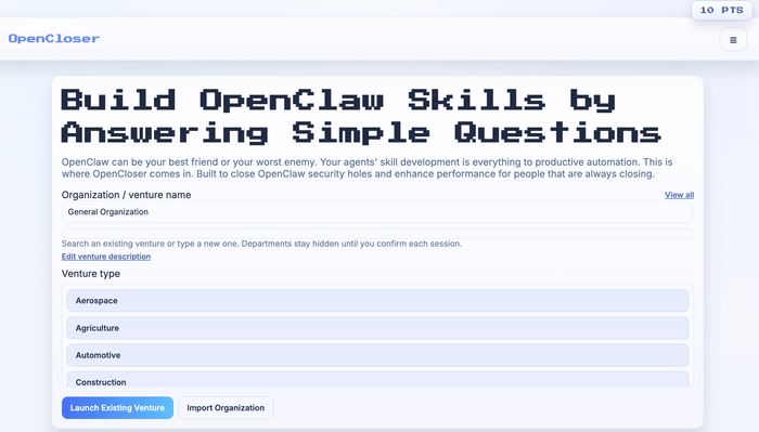 OpenCloser allows your firm to walk through simple questions in order to build out automations your firm wishes to leverage with OpenClaw.