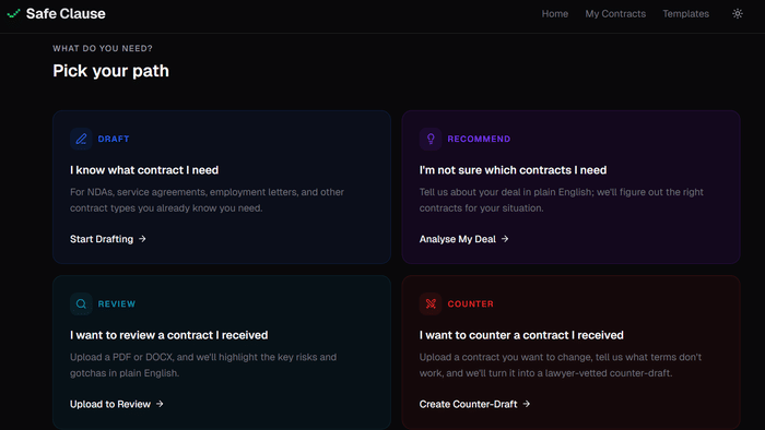 - Recommend: I'm not sure which contracts I need Most early-stage founders don't know what legal protection they're missing until it's too late. The Recommend feature flips the script, users describe their deal or business situation in plain English, and SafeClause figures out which contracts they actually need. It's like having a legal advisor in your corner who asks the right questions before anything gets signed, ensuring no critical agreement falls through the cracks.