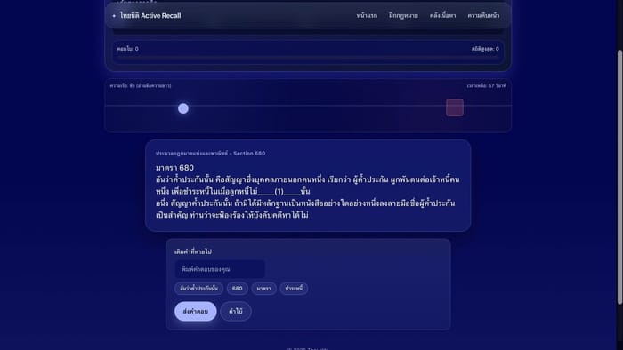 Thai Niti turns Thai legal text into an active recall experience. Instead of passively rereading provisions, users interact with them through structured prompts and simple game mechanics. The goal is not to make law trivial, but to make the process more engaging and less stressful, especially since law school and bar preparation are already demanding.